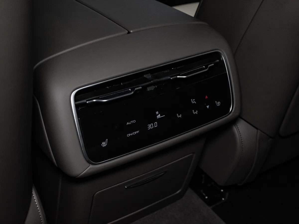 - Центральный подлокотник сидений заднего ряда с подстаканниками, отсеком для хранения и сенсорным экраном управления функциями автомобиля